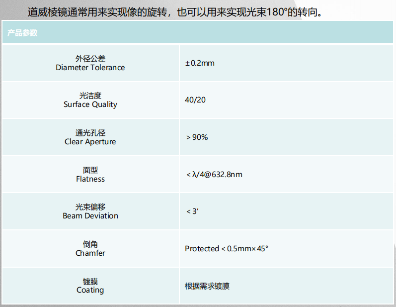 将深圳道威棱镜看作是尖角被截断的九十度棱镜,它可减轻棱镜的体积和杂散光的内折射。当用于会聚光束时,它们会引入像散,因此我们建议将其用于准直光束。此外,这些棱镜也会影响穿透射光束的偏振度。